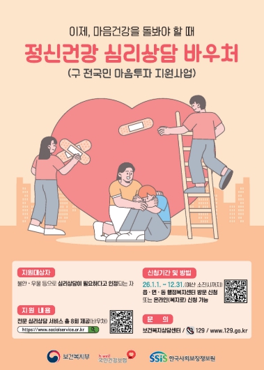 신청은 예산 소진 시까지 연중 가능하며, 신분증과 관련 증빙서류를 지참해 거주지 동주민센터를 방문하거나, 만 19세 이상 성인은 ‘복지로’ 누리집을 통해 온라인 신청할 수 있다. 선정 후에는 주소지와 관계없이 원하는 제공기관을 선택해 상담을 받을 수 있다.