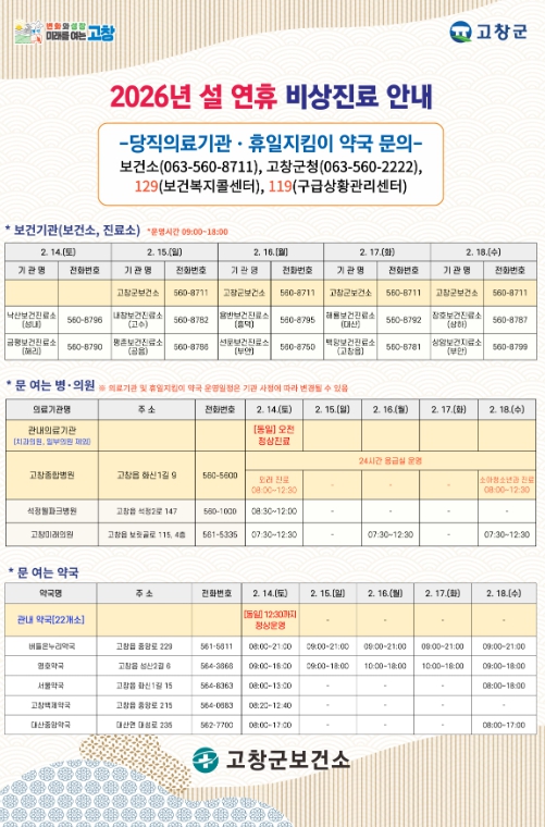 유병수 고창군보건소장은 “설 연휴기간 동안 철저한 비상진료체계를 운영하여, 귀성객과 군민들이 안전하고 건강한 명절을 보낼 수 있도록 최선을 다하겠다”고 말했다.