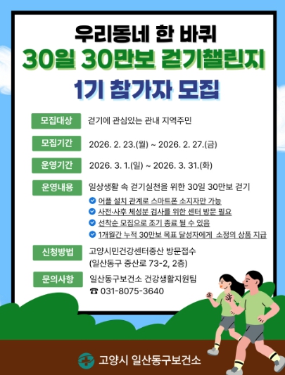 ![]() ‘우리동네 한 바퀴 30일 30만보 걷기 챌린지’1기 참가자 모집 안내문 |