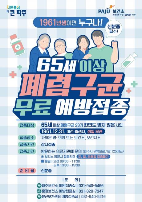 ![]() 파주시, 65세 이상 시민 대상 폐렴구균 예방접종 연중 무료 실시 |