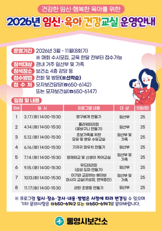 통영시 관계자는 “임신과 출산, 양육 초기 단계에서 필요한 정보를 체계적으로 제공하고 부모의 실질적인 양육 자신감을 높이는 것이 이번 사업의 핵심”이라며 “앞으로도 아이 낳고 키우기 좋은 도시 조성을 위해 수요자 중심의 모자보건 프로그램을 지속 확대해 나가겠다”고 전했다.