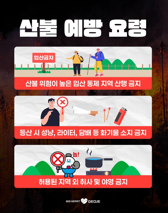 최경호 거제시 산림과장은 “설 연휴 기간은 산불 발생 위험이 매우 높은 시기인 만큼 시민 여러분께서도 산림 인접지역 소각 금지 등 산불 예방 수칙을 반드시 준수해 주시기를 당부드린다”며 “거제시는 산불 예방과 신속 대응을 위해 행정력을 집중하겠다”고 말했다.