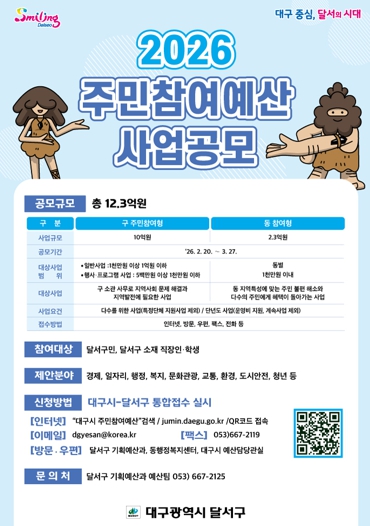 이태훈 달서구청장은 “주민참여예산은 주민이 주인이 되어 우리 마을에 꼭 필요한 사업을 직접 결정하는 뜻깊은 제도”라며, “지역사회를 변화시키는 가치 있는 제안들이 많이 발굴될 수 있도록 구민 여러분의 적극적인 관심과 참여를 당부드린다”고 말했다.