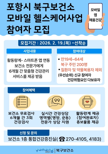 ![]() 포항시 북구보건소 ‘모바일 헬스케어사업’ 참여자 모집 포스터. |