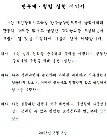 아울러 이날 청렴 서약 실천에 이어 교육감이 주재하는 ‘반부패·청렴 정책 기획단’ 회의를 통해 2026년 반부패·청렴 정책 추진 기본 계획을 공유하고 실천 방안을 논의하는 시간을 가졌다.