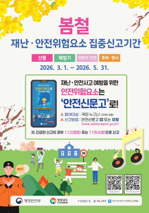 윤환길 경남도 안전정책과장은 “봄철은 산불과 해빙기 시설물 사고 등 안전위험이 증가해 다양한 안전사고가 발생할 수 있는 시기”라며, “위험 요인을 발견하면 안전신문고를 통해 적극 신고해 주시길 바란다”고 당부했다.