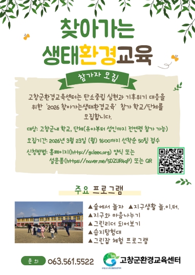 신청 방법과 세부 일정은 고창군 환경교육센터 홈페이지에서 확인할 수 있으며, 문의는 고창군 환경교육센터로 하면 된다.