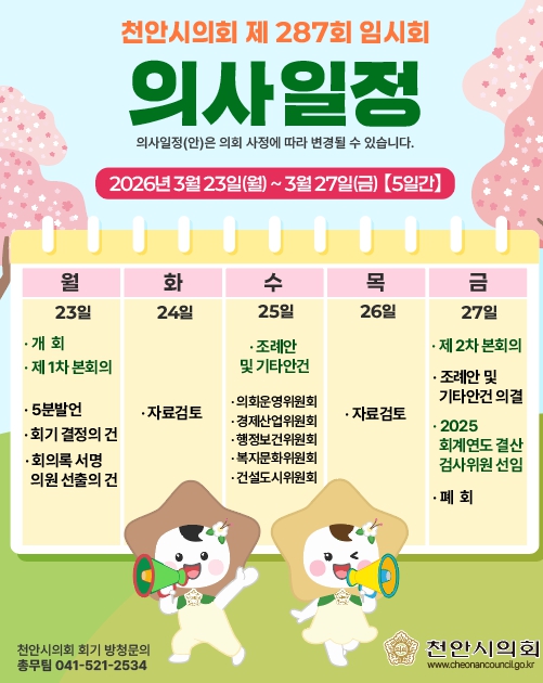 각 상임위원회에서는 ▲천안시 액화석유가스 저장용기 안전관리 등 개선을 위한 지원 조례안 ▲2026년 제1차 수시분 공유재산관리계획안 ▲천안시 장애인 대상 범죄예방 및 피해자 보호에 관한 조례안 ▲천안시 교통약자의 이동편의 증진에 관한 조례 일부개정조례안 등 주요 안건을 심사한다.
