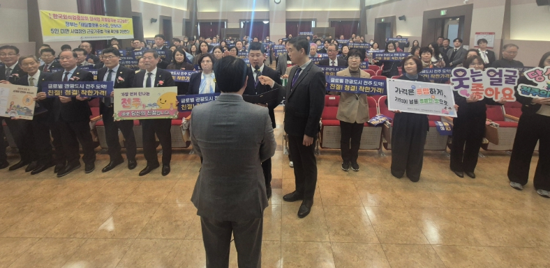 시는 19일 전북지방중소벤처기업청에서 열린 한국외식업중앙회 완산구지부 2026년도 정기총회에서 외국인 관광객 편의 증진을 위한 ‘다국어 메뉴판 지원 릴레이 캠페인’ 및 ‘위생·친절 서비스 실천 결의대회’를 함께 진행했다.
