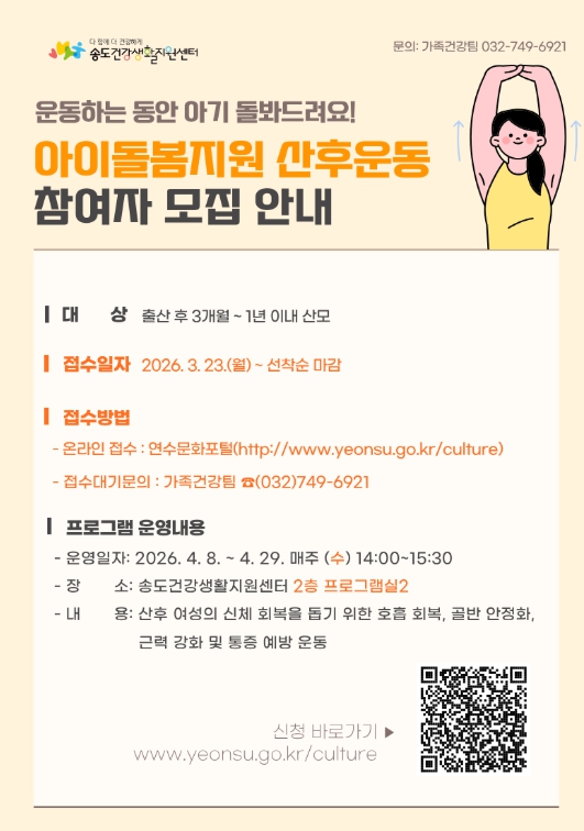 ![]() ‘아이돌봄 지원 산후 회복 운동’ 프로그램 참여자 모집 |