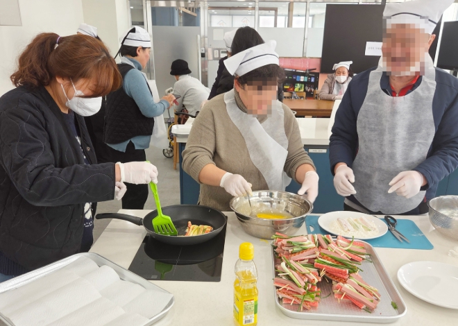 ![]() 광산구 ‘1313 이웃살핌’에 이웃지기, 살핌이웃으로 함께 요리 수업 자조모임에 참여한 주민들이 요리를 배우고 있다. |