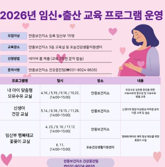 프로그램 참여를 희망하는 임신부는 안중보건지소 건강증진팀으로 문의하면 된다.