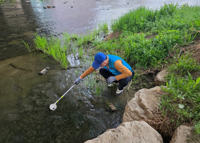 ![]() 모기와 깔따구가 주로 서식하는 하천변을 중심으로 유충 밀도 조사를 하고 있다. |