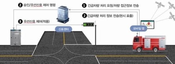 긴급차량 우선신호시스템은 골든타임 확보가 필요한 긴급차량이 차량 내 단말기에 목적지를 입력하면, 위치정보를 바탕으로 교차로 신호를 제어해 현장이나 병원까지 보다 신속하게 이동할 수 있도록 지원하는 시스템이다.