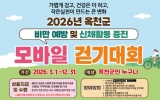 전주시 최준규 기자2026. 02.27[시사토픽뉴스]옥천군보건소는 지역주민의 일상 속 걷기 실천율을 높이고 건강증진을 도모하기 위해 ‘2026년 옥천군 모바일 걷기대회’ 커뮤니티를 운영한다고 밝혔다. 이번 걷기대회는 모바일 걷기 플랫폼 워크온을 활용해 비대면 방식으로 진행되며, 군민 누구나 참여할 수 있다. 운영 기간은 3월 1일부터 12월 31일까지 총 10개월이다. 월별 걷기 챌린지와 돌발 미션을 포함해 총 13회의 건강생활실천 챌린지가 마련된다. 각 챌린지에서 미션을 성공한 참여자에게는 추첨을 통해 다양한 보상품도 제공할 예정이다. 특히 3월 4일 비만예방의...