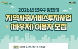 정치 최준규 기자2026. 02.25[시사토픽뉴스] 연수구는 오는 26일부터 다음 달 13일까지 ‘2026년 지역사회서비스투자사업’의 이용자 1천 명을 모집한다. ‘지역사회서비스투자사업’은 지역의 특성과 주민의 수요에 맞춘 맞춤형 사회서비스 이용권(전자바우처)을 지원하는 사업으로, 이용자는 원하는 서비스와 제공기관을 선택해 이용할 수 있다. 연수구는 ▲아동 정서발달서비스, ▲아동청소년 심리지원서비스, ▲오감쑥쑥서비스, ▲장애인보조기기 렌탈서비스, ▲장애인 재활승마서비스, ▲장애아동 학습지원서비스, ▲정신건강 토탈케어서비스, ▲시각장애인 안마서비스, ▲성인 심...