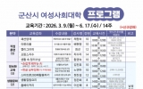 군산시 최준규 기자2026. 02.20[시사토픽뉴스]군산시 여성사회대학이 오는 2월 24일부터 27일까지 상반기 프로그램 수강생을 선착순 모집한다. 이번 프로그램은 ▲직업훈련 교육(패션양재 등 5개) ▲정보화 교육(손쉽게 배우는 AI 등 3개) ▲생활문화 교육(생활집밥요리 등 2개) ▲교양 교육(보태니컬아트와 색연필화 등 13개) ▲건강 교육(요가 등 5개) ▲야간 교육(통기타초급 등 3개) 분야별 총 31개 강좌가 운영되며, 손쉽게 배우는 AI 등 19개 강좌는 남성 회원도 참여할 수 있다. 교육 기간은 3월 9일부터 6월 17일까지 총 14주(공휴일 제외, AI...