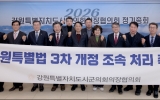 전라남도 최준규 기자2026. 02.18[시사토픽뉴스] 2026년 강원특별자치도시군의회의장협의회 정기총회가 13일 춘천 세종호텔에서 열렸다. 이날 정기총회에서 최익순 협의회장(강릉시의회 의장)은 선진 지방의회 구현을 위해 노력해 온 한해를 돌아보고 공통 관심사에 대한 협업체제 강화 및 지방의정 발전 방안을 모색했으며, '강원특별법 3차 개정 조속 처리 촉구 건의문', '철원·춘천·홍천·횡성·원주 철도 '제5차 국가철도망 구축계획'반영 촉구 건의문', '지방교육자치법 개정에 따른 양양교육지원청 신설 촉구 건의문'을 의결하며 지역 현안 공동대응에 나섰다. 특히 최익...