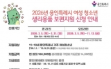 사회 최준규 기자2026. 03.03[시사토픽뉴스]용인특례시는 5일부터 31일까지 여성 청소년 생리용품 보편지원사업 신청을 받는다고 3일 밝혔다. 청소년 본인이나 동일 세대 가족이 경기민원24(http://gg24.gg.go.kr)의 '경기민원 신청'에서 5일 오전 10시부터 신청할 수 있다. 동일 세대 외 가족 또는 외국인, 국내 거소자는 읍면동 행정복지센터에서 현장 접수도 가능하다. 대상은 용인에 주민등록, 외국인등록, 국내거소신고를 한 11세부터 18세까지(2008년 1월~ 2015년 12월 31일)의 여성 청소년이다. 지원액은 1인당 월 1만 4000원...