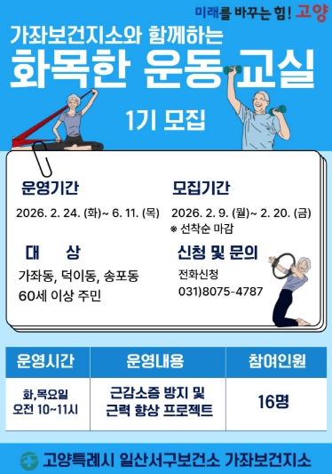 이번 프로그램은 가좌동, 덕이동, 송포동에 거주하는 60세 이상 주민을 대상으로 하며, 2월 24일부터 6월 11일까지 16주 동안 매주 화ㆍ목요일 오전 10시에 가좌보건지소에서 진행된다.