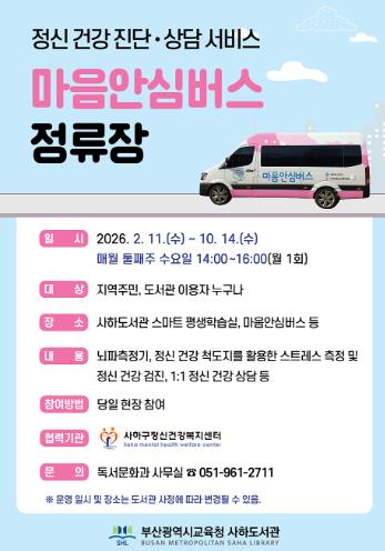 ‘마을안심버스’는 사하도서관 마당에 위치한 버스에서 설문, 뇌파·혈관 건강도 측정 등을 통해 스트레스 지수를 확인하고, 스트레스 대처와 완화, 위험군 조기 발견을 위한 1:1 상담을 해주는 이동식 상담소다.
