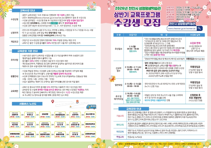 ![]() 천안시 성정평생학습관 ‘2026년 상반기 교육 프로그램’ 수강생 모집 홍보문. |