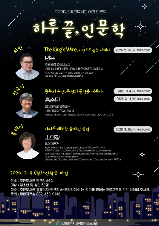 모집은 2월 9일부터 주안도서관 누리집에서 청소년과 성인을 대상으로 선착순 진행되며, 자세한 사항은 주안도서관 종합자료실로 문의하면 된다.