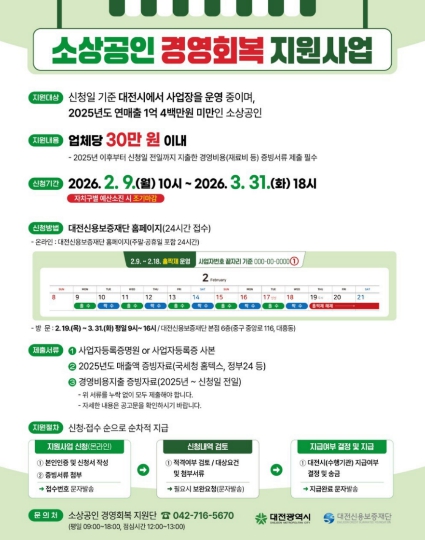 신청 기간은 2월 9일 오전 10시부터 3월 31일 오후 6시까지이며, 대전신용보증재단 홈페이지를 통한 온라인 접수로 진행된다.