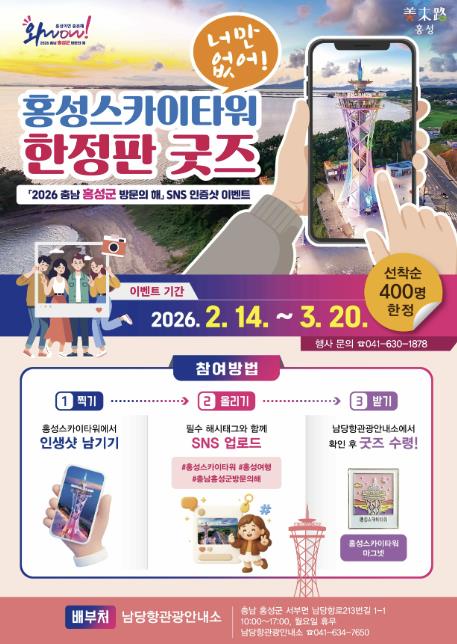 군에 따르면 2026년 ‘충남 홍성군 방문의 해’를 맞아 홍성군은 소장 욕구를 자극하는 한정판 홍성스카이타워 굿즈를 내걸고 파격적인 SNS 인증 이벤트를 전개한다.
