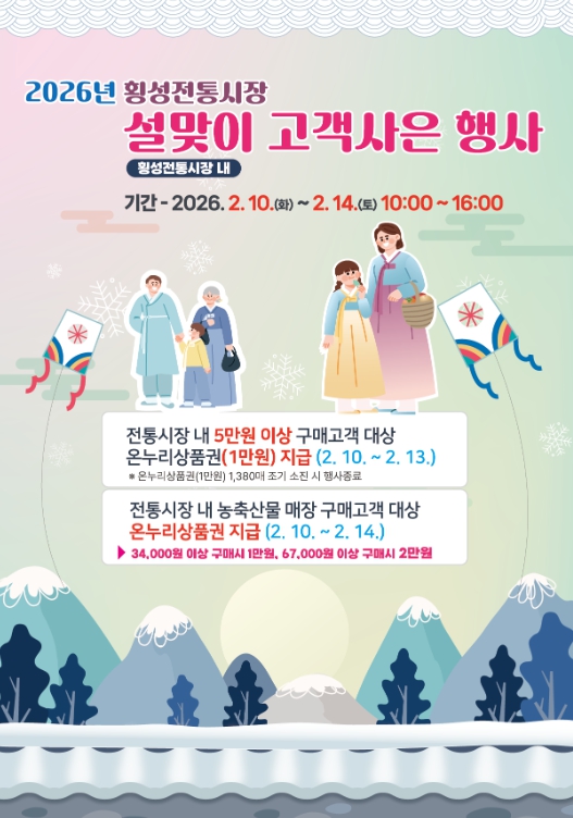 군은 2월 10일부터 14일까지 5일간 횡성 전통시장 일원에서 ‘2026년 설맞이 고객 사은 행사’를 개최한다고 밝혔다.
