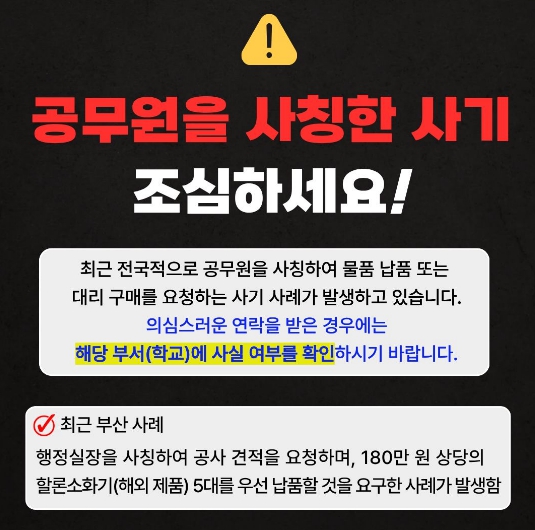 교육청 관계자는 “학교나 교육청은 어떠한 경우에도 업체에 물품 대리 구매를 요구하거나 개인 계좌로 대금 송금을 유도하지 않는다”며, “학교 관계자라며 연락이 오더라도 반드시 기관 공식 전화번호로 사실 여부를 재확인달라”고 당부했다.