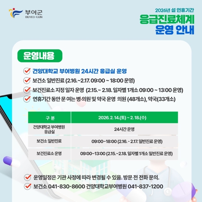 또한, 2월 16일과 설날 당일(2월 17일)에는 부여군보건소에서 일반진료를 정상 운영(09:00~18:00) 한다. 보건진료소는 2월 15일부터 18일까지 4일간 1일 1개소씩(은산가곡보건진료소, 내산지티보건진료소, 임천가신보건진료소, 세도귀덕보건진료소)을 오전 9시부터 오후 1시까지 운영하여 응급상황에 대비하고 의료서비스 공백을 줄이기 위해 최선을 다하고 있다.