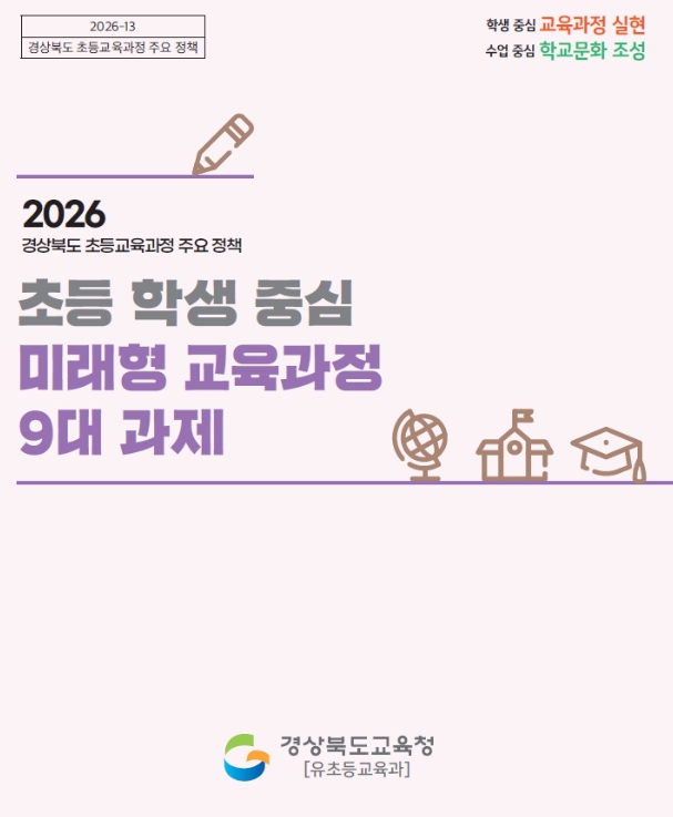 2026 ‘초등학생 중심 미래형 교육과정 9대 과제’ 정책 자료는 도내 전 초등․특수학교와 교육지원청, 직속 기관에 배부되며, 경북교육청 누리집과 수업나누리를 통해서도 확인할 수 있다.