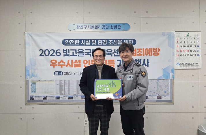 이번 인증패 전달식은 빛고을국민체육센터가 ‘범죄예방 우수시설 인증’을 획득한 결과로, 지난 2020년 광산구 공공시설 중 최초 인증 후 3연속으로 선정됐다.