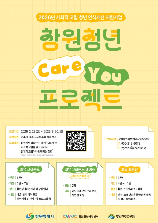 박정의 창원청년비전센터장은 “본 프로그램을 통해 청년이 일상 속 무기력함을 해소하고 새로운 관계형성을 통해 삶의 활력을 되찾길 바란다”며 적극적인 참여를 당부했다.