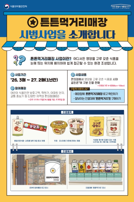 올해는 시범 사업(2026년 3월~2027년 2월)을 통해 식약처-지방정부-편의점 업계가 협력하여, 현재 121개 매장을 시작으로 연내 300개 매장 이상으로 확대하고 ‘튼튼먹거리 구매인증 이벤트’를 통해 소비자 홍보도 강화할 예정이다.
