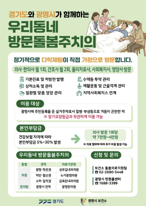 진료는 민간 의료기관 4곳과 보건소가 협력해 운영한다. 양방 진료는 광명·학온권은 성모길내과의원, 철산·하안권은 누가광명의원, 소하·일직권은 김옥란내과의원이 맡고, 한방 진료는 광명한의원이 담당한다.
