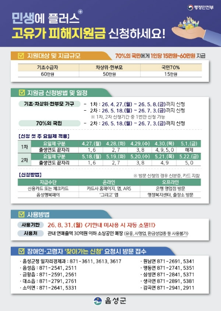 이번 지원금의 지급 대상은 올해 3월 30일 기준, 70%의 국민에게 소득 수준과 거주 지역에 따라 차등 지급한다. 특히 음성군은 비수도권으로 기초수급자 60만원, 차상위 및 한부모 50만원, 소득하위 70% 군민은 1인당 15만원을 지급받는다.