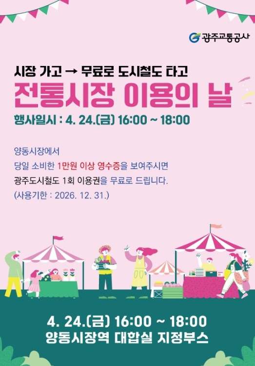 공사는 오는 4월 24일 서구 양동시장에서 행사를 개최하고, 당일 시장 이용객을 대상으로 도시철도 무료 이용권을 증정한다고 밝혔다.
