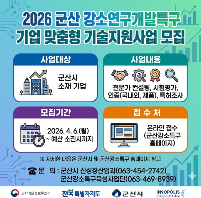 사업 신청은 예산 소진 시까지 상시 접수로 진행되며, 군산 강소특구 홈페이지에서 온라인으로 신청할 수 있다. 자세한 사항은 군산시 신성장산업과 또는 군산 강소특구육성사업단으로 문의하면 된다.
