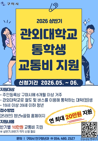 지원 대상은 구미시에 6개월 이상 거주하는 19세부터 39세까지의 관외로 통학하는 대학(원)생이다.