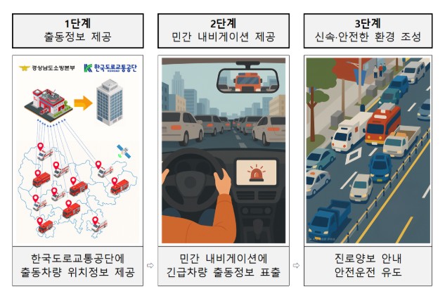 경남소방본부는 이러한 서비스 구현을 위해 지난해 10월 한국도로교통공단과 업무협약을 체결하고, 경남소방의 실시간 출동 데이터를 도로교통공단과 경찰청 도시교통정보센터를 거쳐 민간 내비게이션 플랫폼과 연계하는 통합 협력체계를 구축했다.